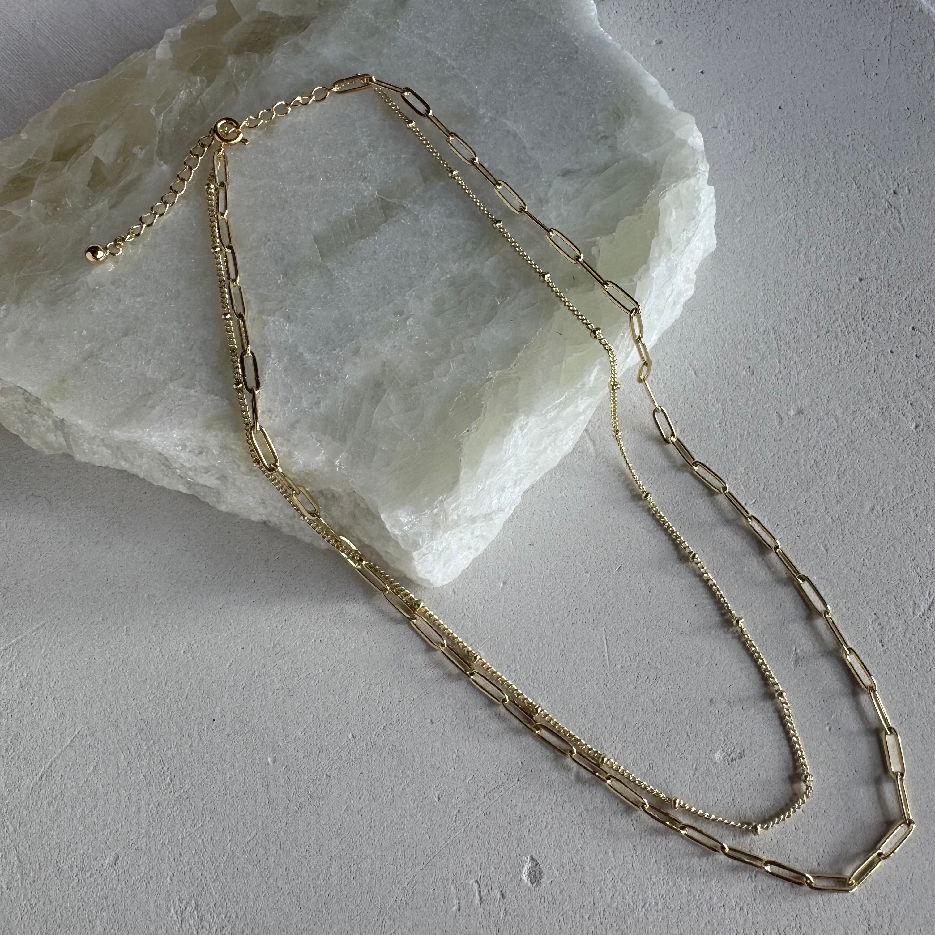 無駄のないデザインでどんな装いにもすっとなじむコンビチェーンネックレス。