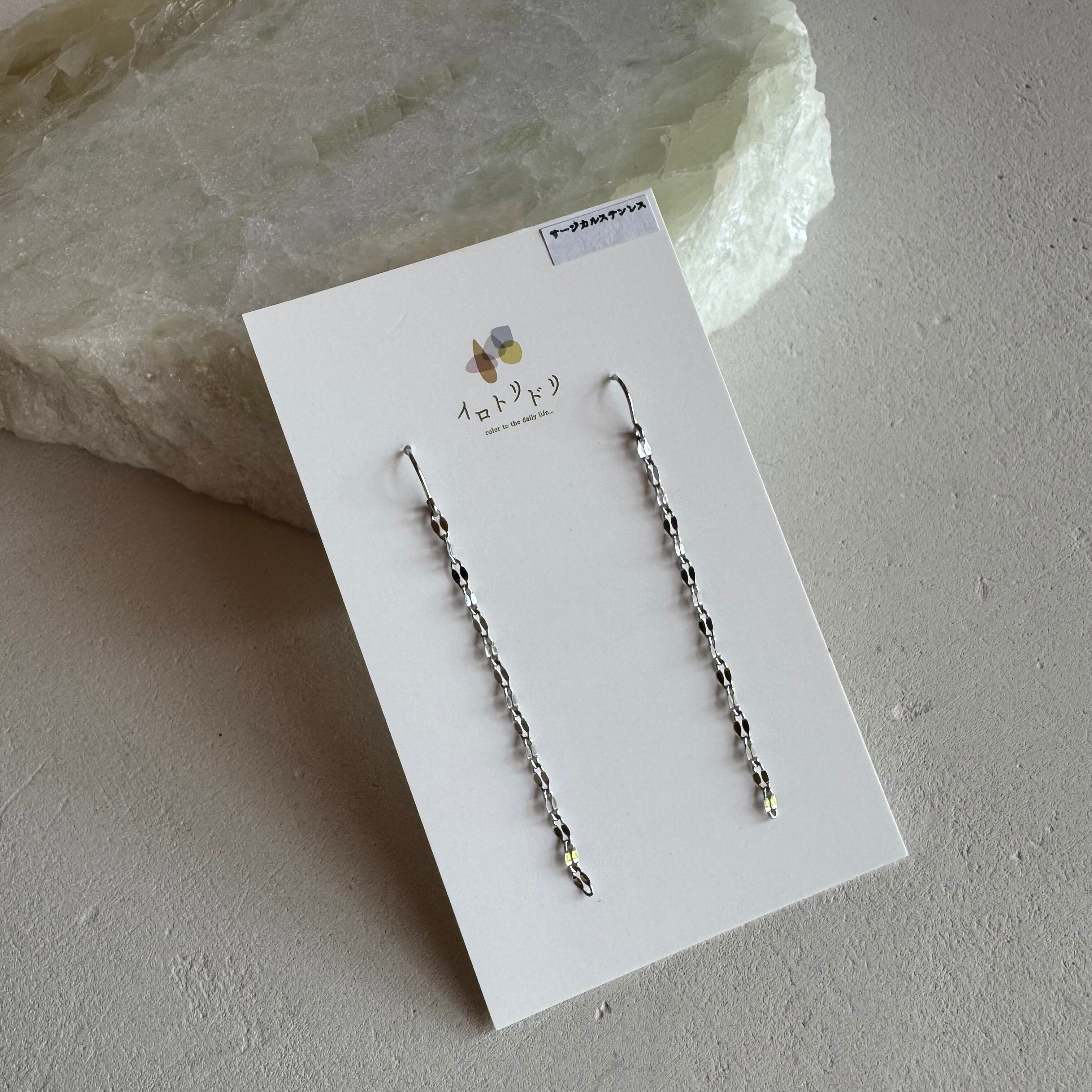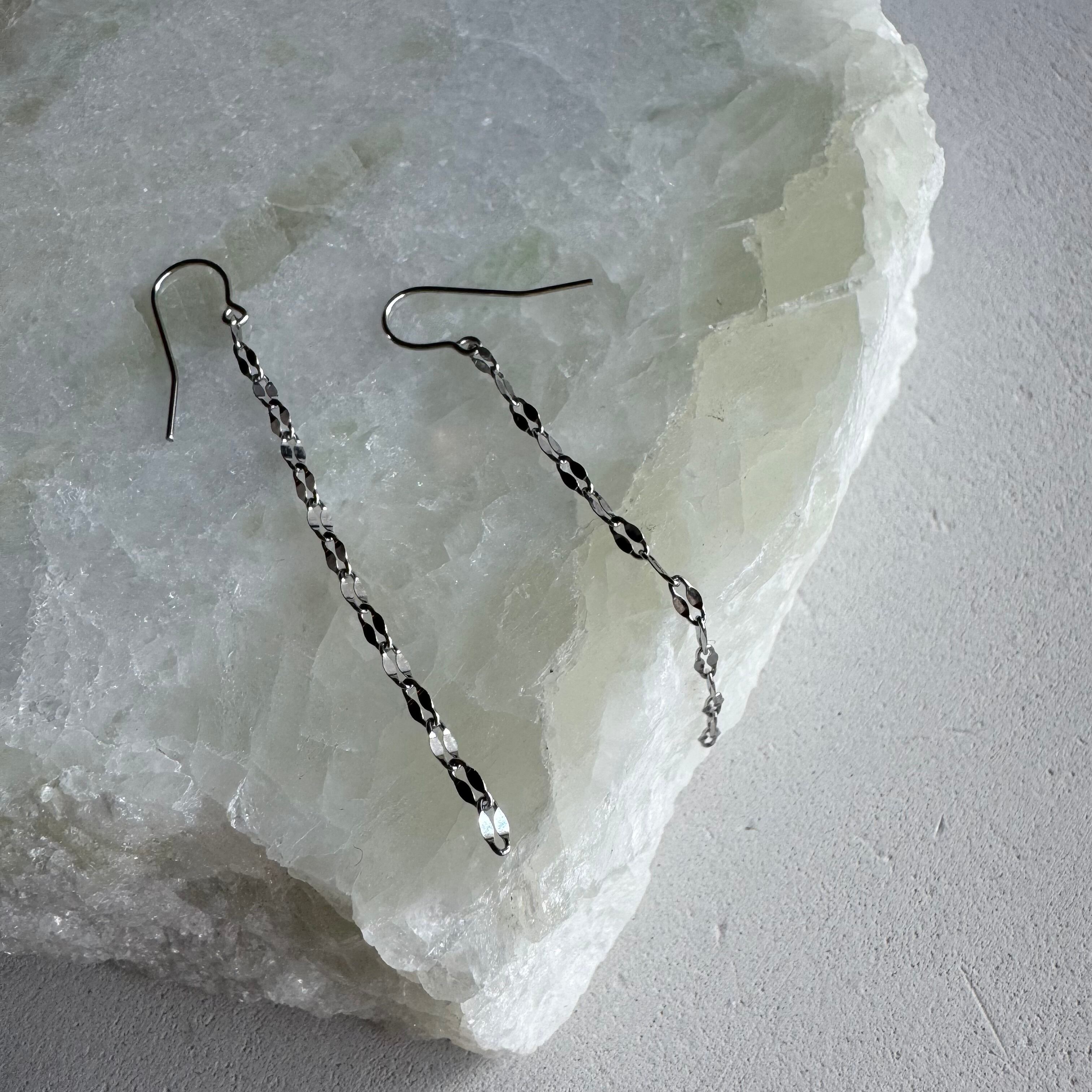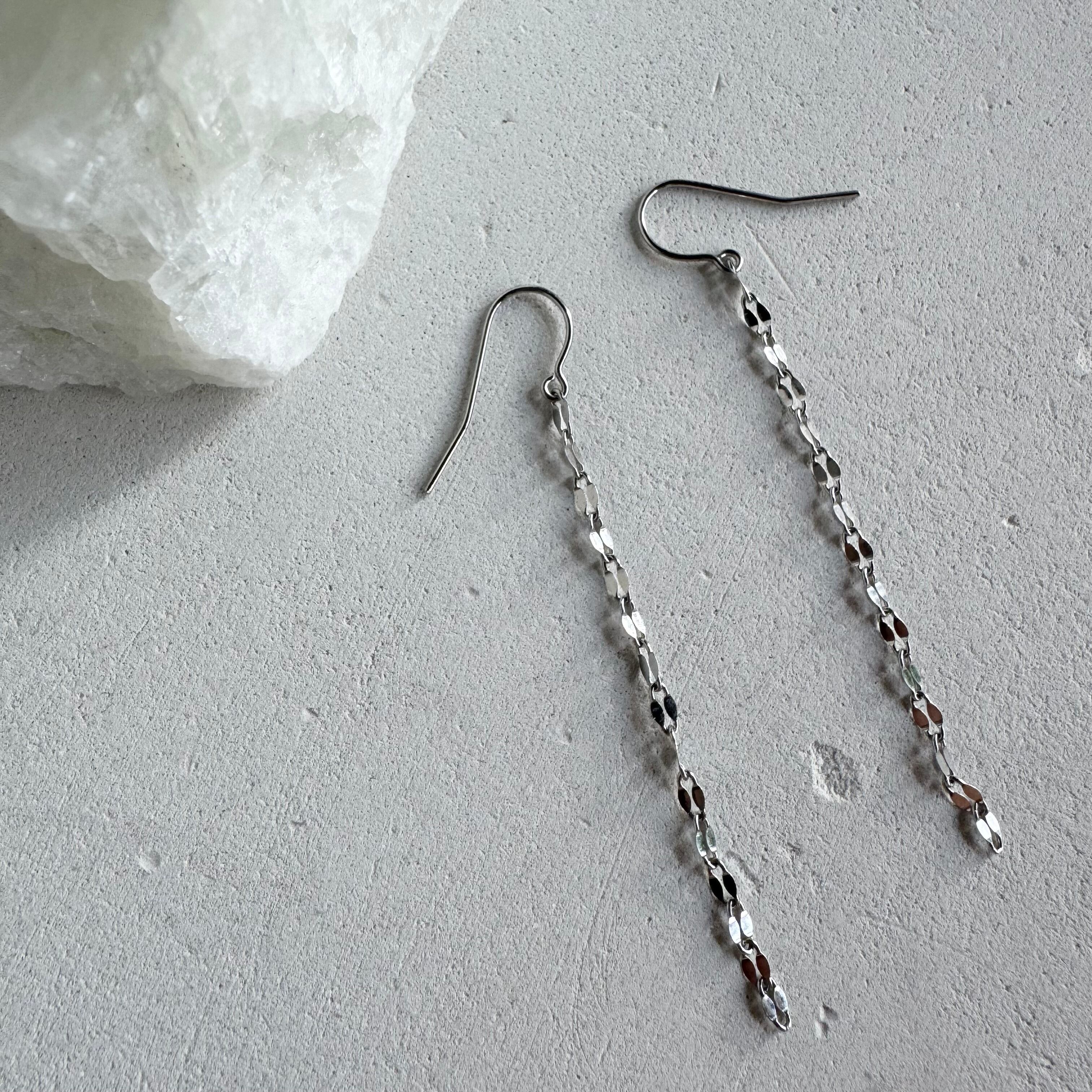 繊細なチェーンが光を受けてきらきらと輝くシンプルで上品なロングチェーンピアス。