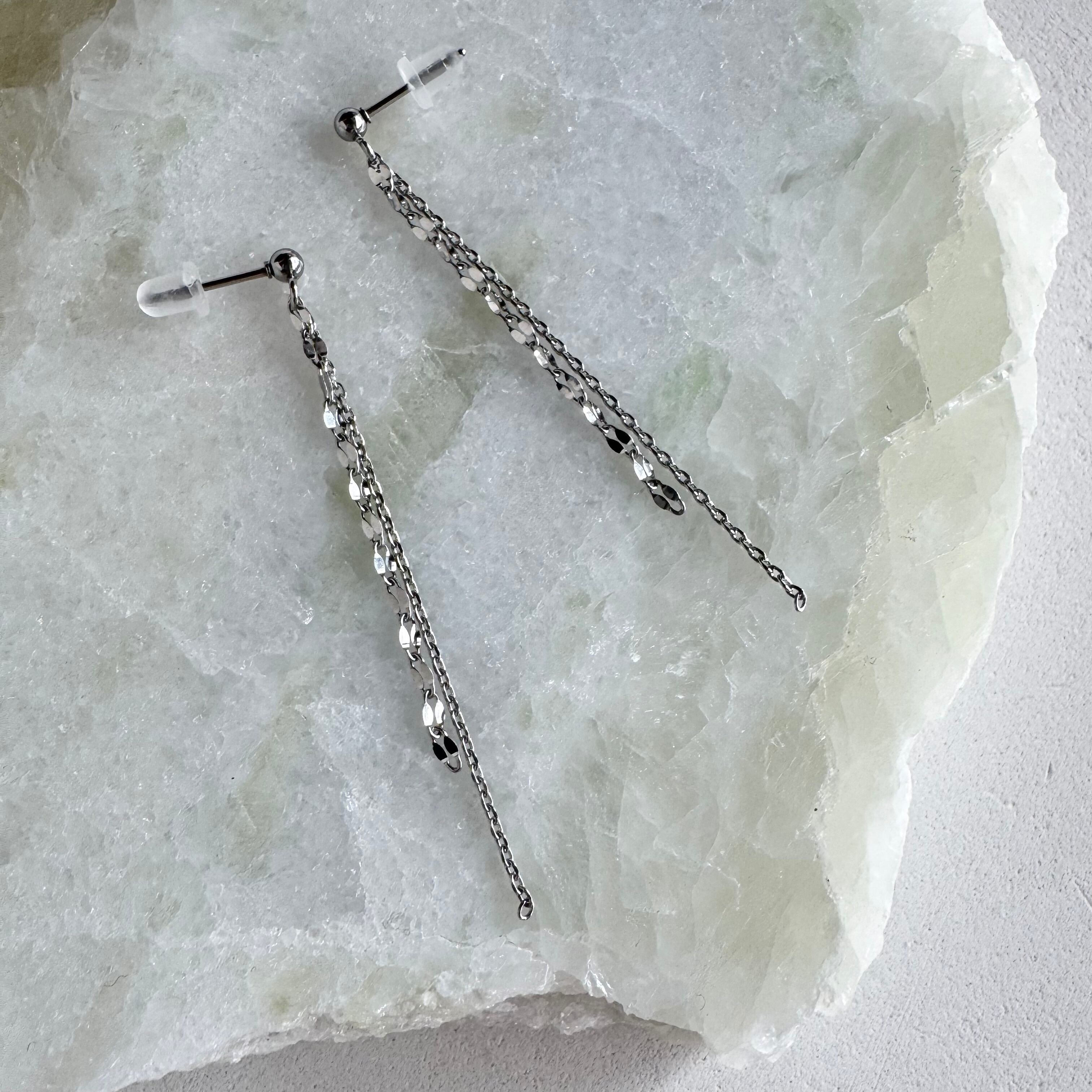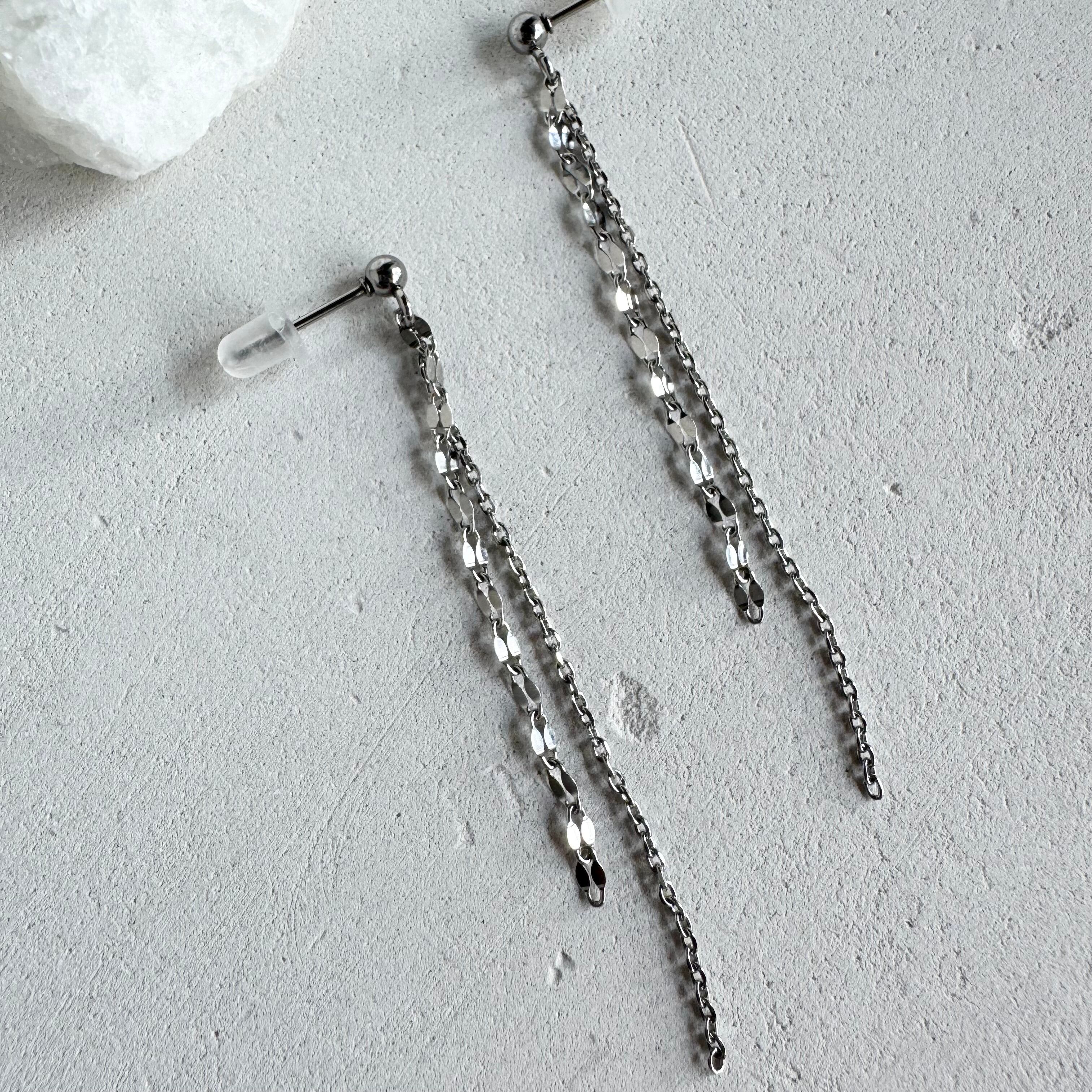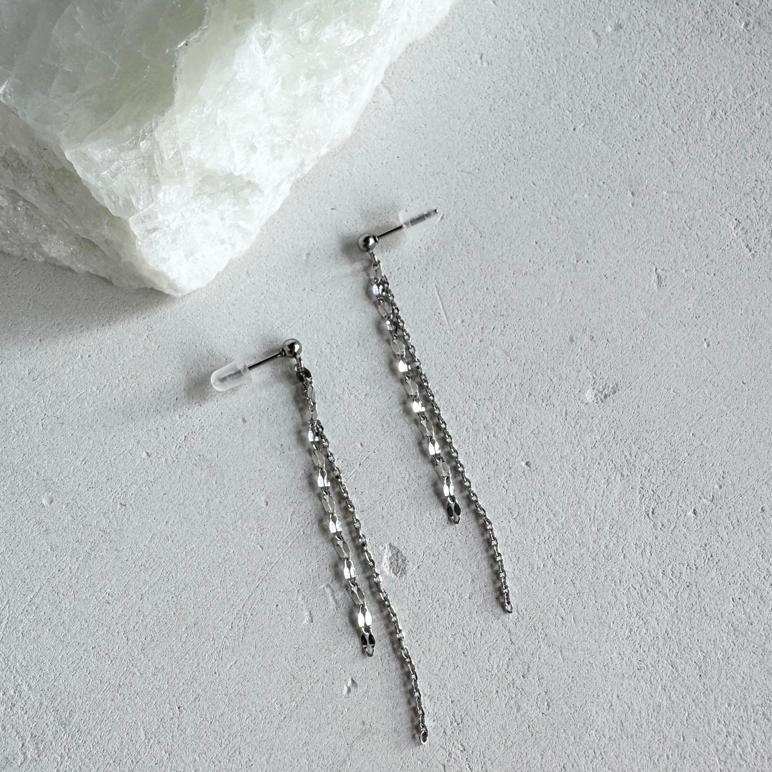 長さの異なる2本のチェーンが揺れるさりげない個性を楽しめるチェーンピアス。