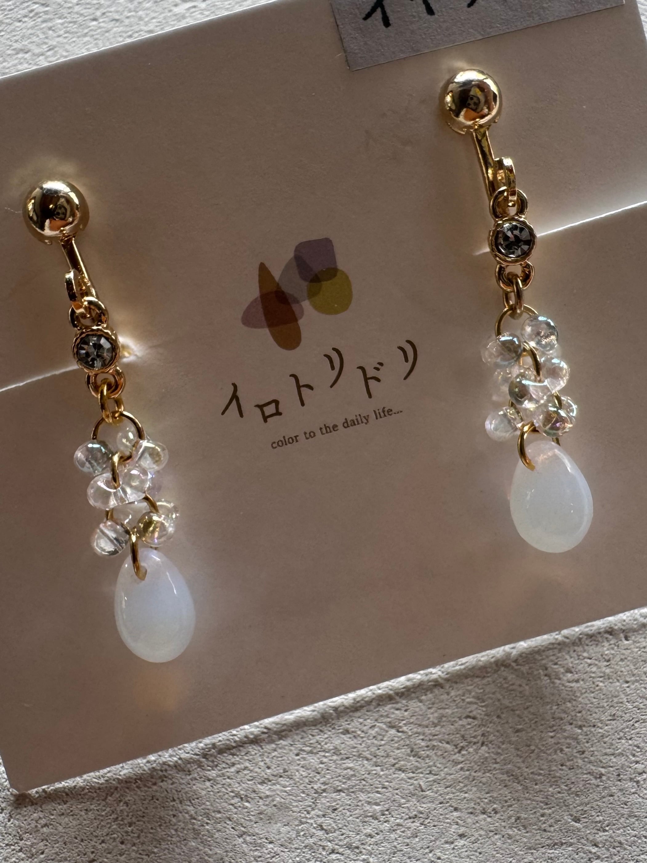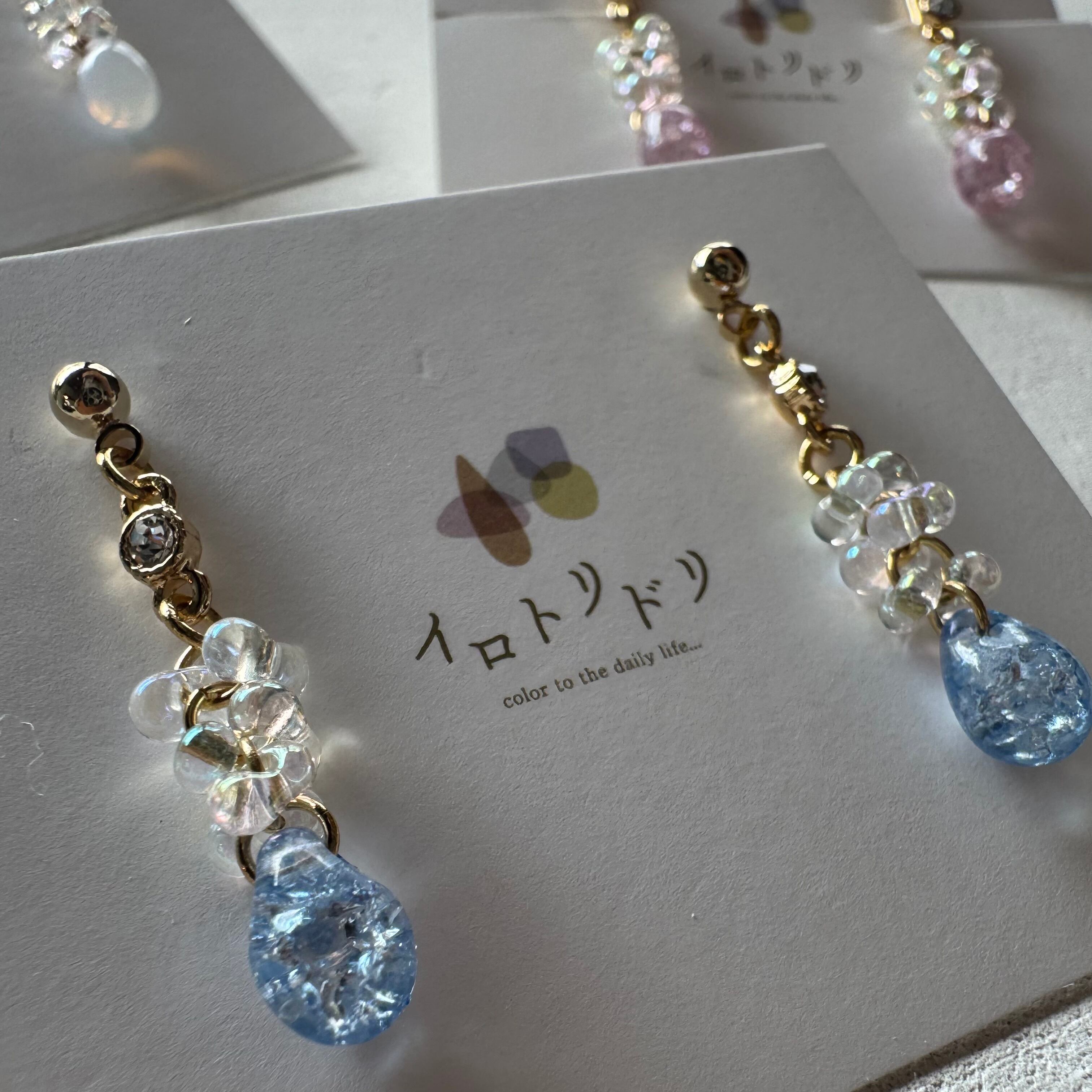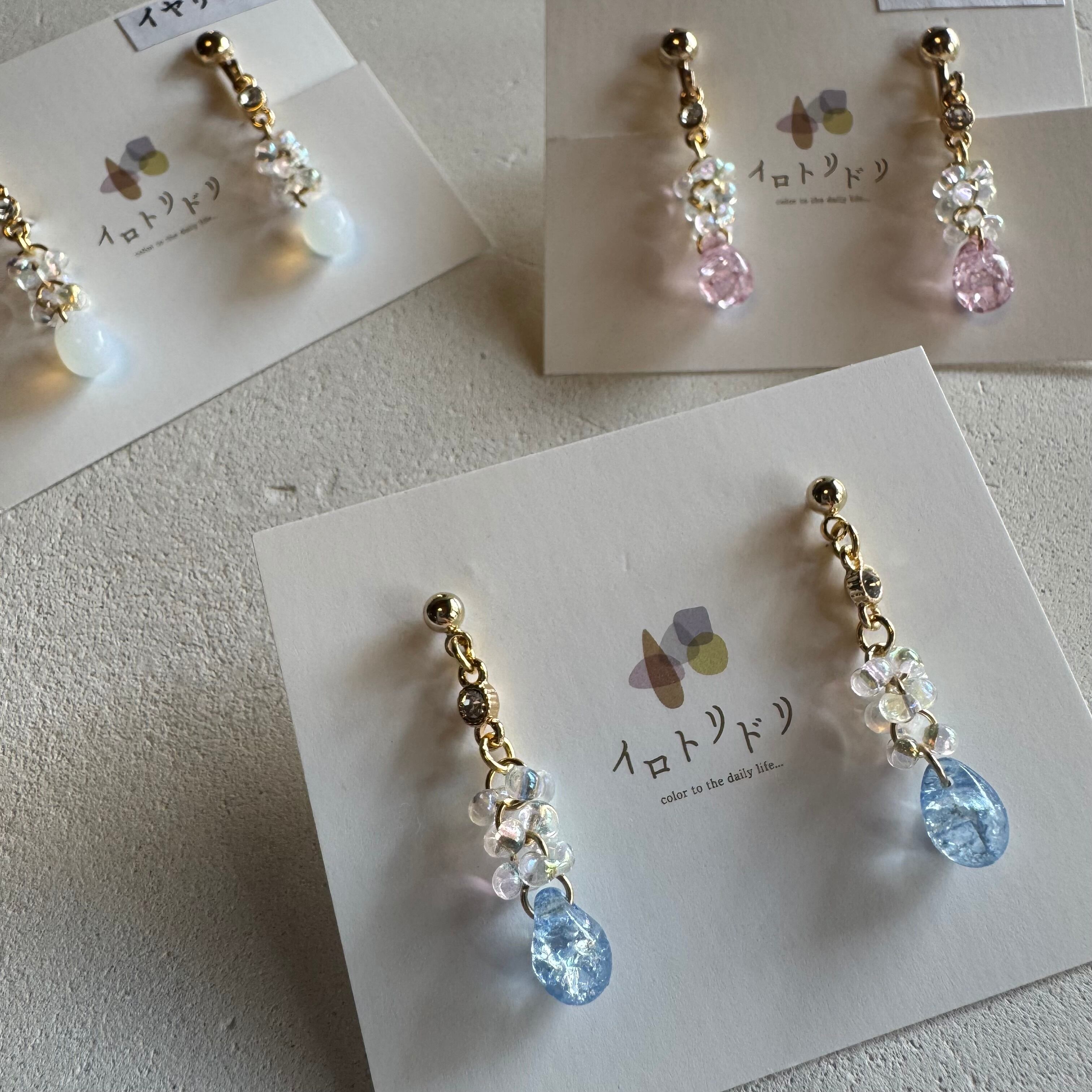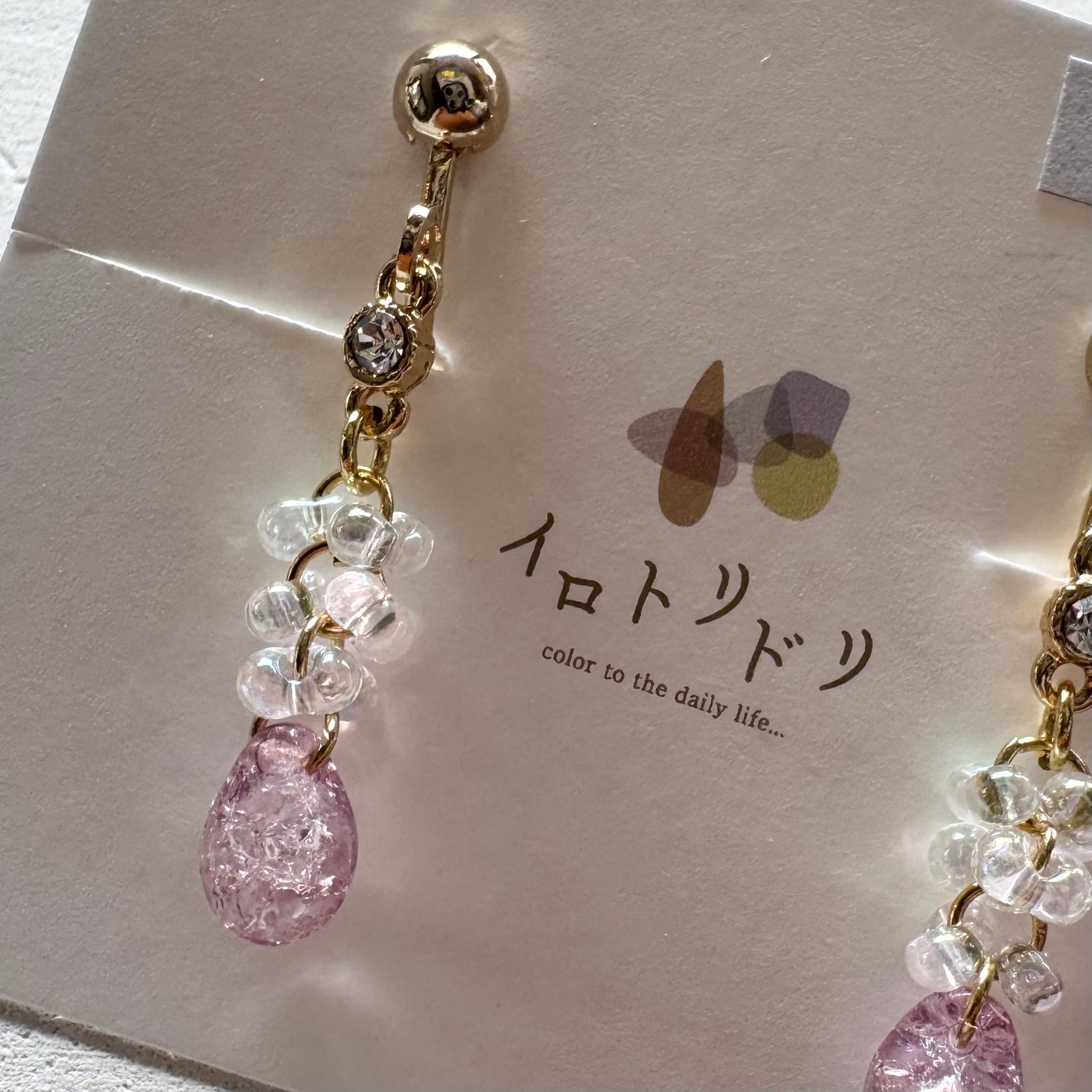 小ぶりなサイズ感ながらチェコビーズ特有のキラッとした透明感とドロップ型のそれぞれのカラーがやさしく揺れるデザイン。